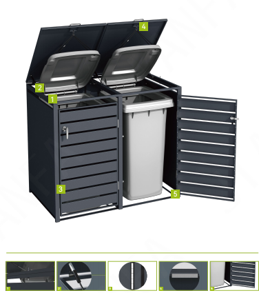 Die Mülltonnenbox sollte einmal im Jahr mit einem feuchten Tuch gereinigt werden. Anschließend kann bei Bedarf eine ölige Metallpflege aufgetragen werden, um die Oberfläche zu schützen.